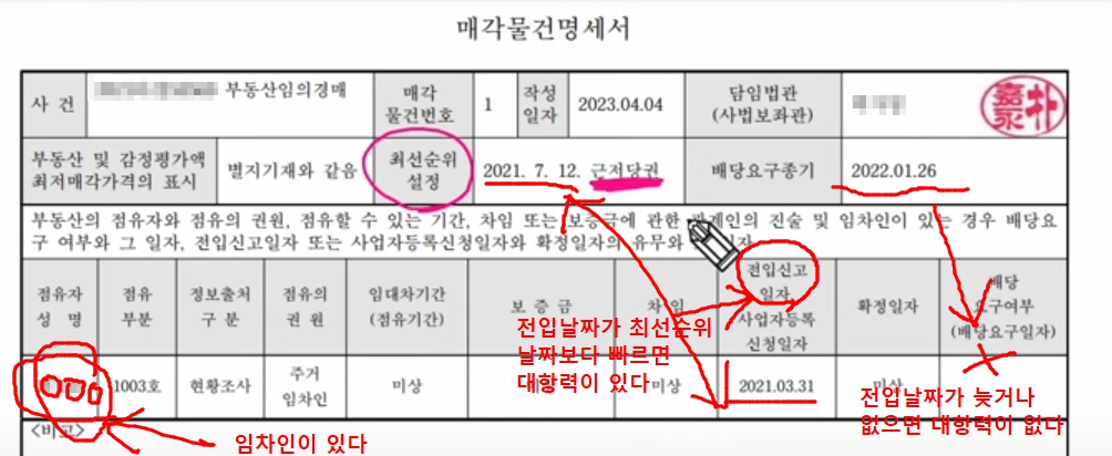 반대로 전입날짜가 최선순위날짜보다 늦거나 아예 기재되어 있지 않다면 대항력이 무조건 없다.